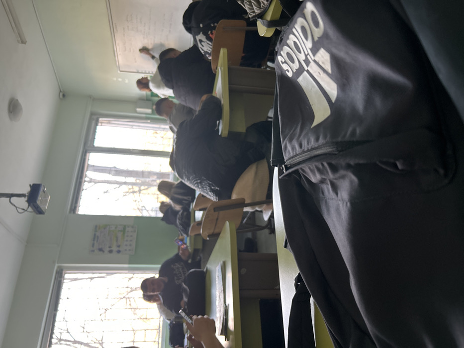 The image depicts an indoor classroom scene within a building in Sliven, Bulgaria. The perspective is from a desk in the foreground, looking towards the front and left side of the room. In the immediate foreground, a black Adidas branded drawstring bag with a white logo is present on a light green desk surface on the right. To the left, a person's hand holds a dark-colored smartphone horizontally over a light green desk. Multiple individuals, presumed to be students, are seated at light green desks with wooden chairs arranged in rows. A male student in a dark shirt is visible in the left midground, looking down at his desk. Other students are largely observed from behind, with several leaning forward over their desks. On the right side of the room, a person in a white long-sleeved top, identified as a teacher, stands at a large white board, actively using their right hand to write or erase content on its surface. The classroom features light green walls with a lighter strip near the ceiling. Two large windows on the left wall provide bright natural illumination, revealing bare tree branches outside. A ceiling-mounted projector is visible near the left window. A series of colored charts are affixed to the wall between the windows. A white security camera is mounted on the wall above the whiteboard. The ceiling is white with a circular light fixture.