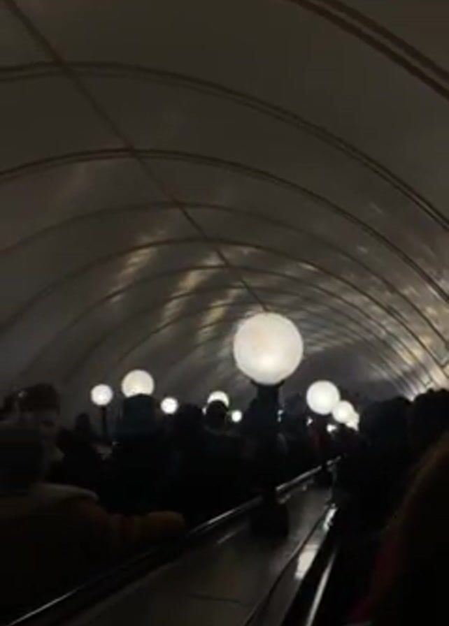 crowded escalator ascending into what appears to be a subway station. The station's architecture features a curved, arched ceiling lined with rows of spherical, illuminated light fixtures. The majority of people visible are facing forward on the escalator, their forms are silhouetted against the light. The atmosphere is dimly lit, accentuating the glowing lights.