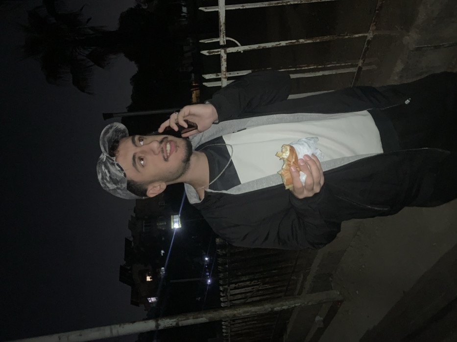 The image portrays a young adult male standing outdoors at night in Barza Municipality, Syria