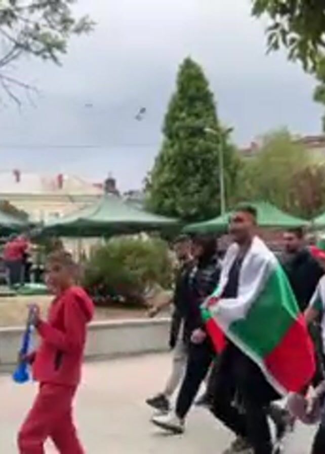 A group of people are walking down a sidewalk on a cloudy day. Several of them are waving Bulgarian flags and cheering. In the background, there are trees, green tents, and a white building with a green roof. One man is carrying a child on his shoulders, and another child is walking with a blue horn.