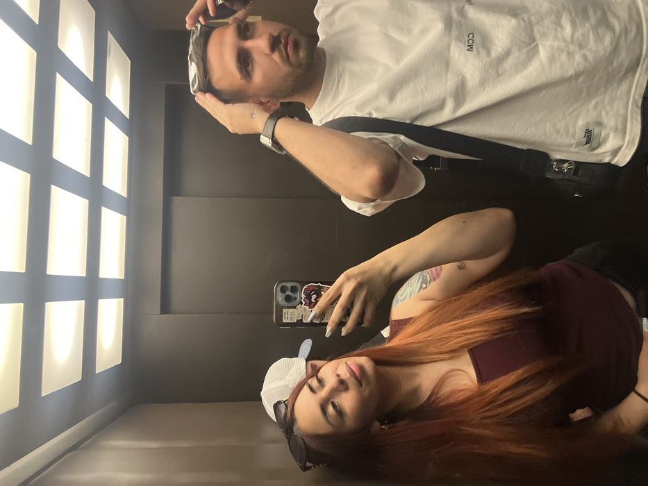 A selfie shows two people in an elevator. A man in a white t-shirt and watch poses with sunglasses on his head. A woman with long, reddish-orange hair, a white baseball cap, and sunglasses tilted on her face takes the photo with her phone. The elevator has gray walls and a wall of rectangular lights. The overall composition is somewhat tilted.