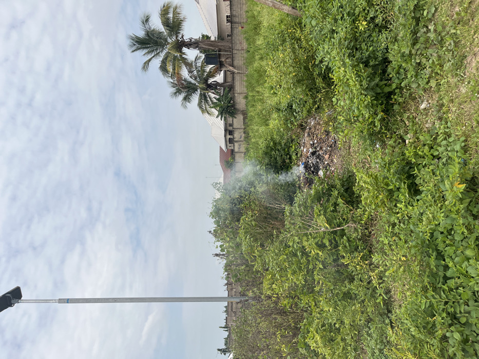 The image captures an outdoor scene in Gwagwalada, Nigeria, featuring an overgrown undeveloped area adjacent to residential properties