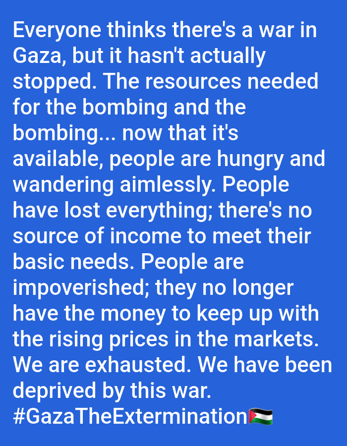 The image is a text-based post expressing concerns about the ongoing situation in Gaza. It states that the war hasn't stopped, and resources are used for bombing while people are left hungry, aimless, and impoverished, unable to meet basic needs or keep up with rising prices. The post conveys a sense of exhaustion and deprivation due to the war. The hashtag "#GazaTheExtermination" and a Palestinian flag emoji are included, suggesting a dire and urgent situation.