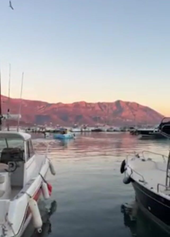 calm harbor with several boats docked. The water is still and reflects the pink and orange hues of the setting sun. In the background, a mountain range glows with the same pinkish light. A single seagull flies in the sky. A small blue boat moves in the water further in the harbor. The camera pans slightly across two adjacent boats docked at the edge of the harbor.
