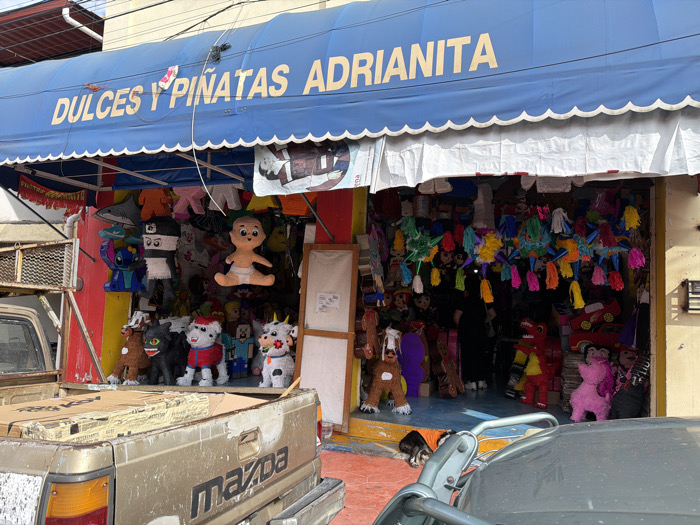 A vibrant piñata shop, "Dulces y Piñatas Adrianita," displays a colorful array of piñatas under a blue awning