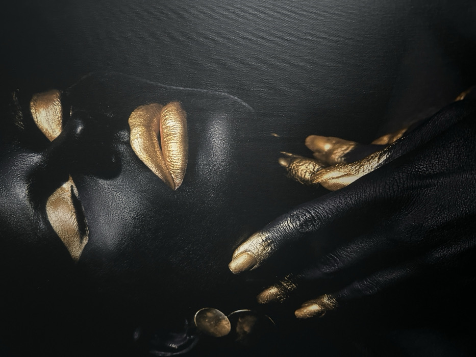 The image displays a close-up artistic portrait of an individual, likely female, whose visible skin, including the face and left hand, is uniformly covered in matte black paint. The subject's eyes are closed, and their lips and eyelids are coated in a metallic gold paint. The fingernails of the visible left hand are also metallic gold, and several gold metallic adornments are wrapped around the fingers. A metallic gold earring, consisting of two circular disc-like elements, hangs from the left earlobe. The left hand is positioned with fingers gently resting against the right side of the subject's neck and jawline. The background is a plain, dark, undifferentiated surface, characteristic of a studio setting. No identifiable geographic or urban location, including any specific location within Silistra, Bulgaria, is depicted or discernible in the scene.
