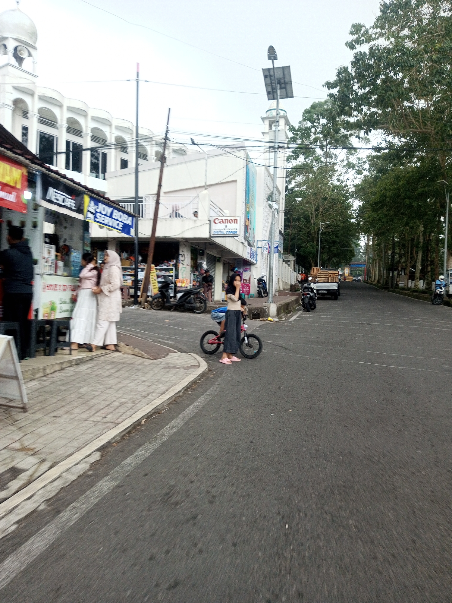 An outdoor street scene depicts a daytime urban environment. In the immediate foreground, a young female with dark hair, wearing a light-colored top and dark wide-leg pants, stands barefoot in pink flip-flops beside a small bicycle with pink pedals, facing slightly left. The asphalt road extends into the background, marked by a white line on the right, and is mostly clear of traffic, with a white pickup truck loaded with wooden planks visible further down. The left side of the scene features a paved sidewalk. On the sidewalk, to the left of the foreground subject, two women are present near a street-side stall. One woman wears a light-colored hijab and a long, light-colored outfit, while the other wears a pink top and a long white skirt; they appear to be conversing or waiting. A man in a dark top is partially visible at the far left, facing away. The stall displays "NESCAFE" and "A-JOY BOBA SERVICE" signage. Behind the stall, a multi-story white building with a distinctive dome and arched windows is visible. Further along the street on the left, another white building features a "Canon" sign and an "ATM" sign. Utility poles with overhead wires traverse the scene, one equipped with a solar panel. The right side of the street is lined with numerous tall trees featuring dense green foliage. In the distant background, other vehicles, including motorcycles, are visible. The sky is uniformly bright and overcast. The specific location of Kan Beit, Myanmar, cannot be confirmed from the visual information provided.