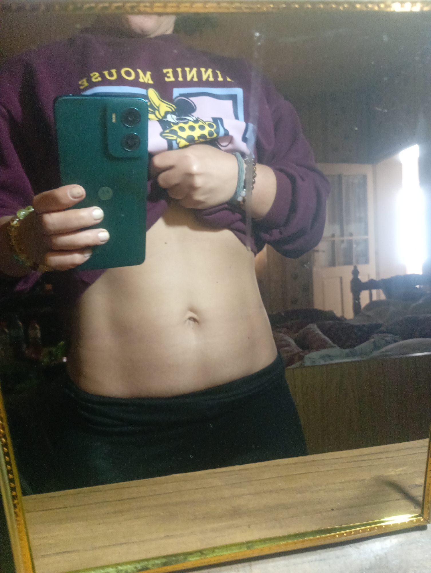 A person is taking a mirror selfie in what appears to be a bedroom in Alfatar, Bulgaria. The person is wearing a maroon sweatshirt with a "Minnie Mouse" graphic and black leggings. They are holding a dark green cell phone with dual cameras, partially obscuring their face. Their torso is visible, showing a flat stomach with a navel. Bracelets adorn their left wrist. The bedroom is cluttered with bedding and furniture. The mirror has a gold frame.