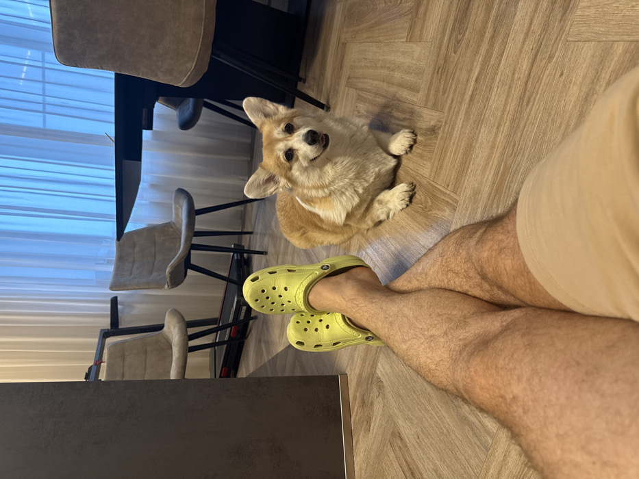 An indoor scene within a residence in Krasnoyarsk, Russia, depicts a person and a dog. In the foreground, the lower half of an individual is visible, including crossed legs clad in light-colored shorts. The left foot wears a lime-green Croc, while the right foot is partially removed from a matching Croc. To the right of the person's legs, a Pembroke Welsh Corgi dog with tan and white fur lies on a light-colored wooden floor, facing towards the person with its mouth slightly open. The background reveals a modern interior with a dark partition wall on the left. Behind this, a black treadmill and two modern dining chairs with grey upholstered seats and black legs are visible. Further right, a dark rectangular table is present. The entire background is illuminated by ambient light filtering through sheer white curtains covering a large window. The scene suggests a relaxed, domestic environment.
