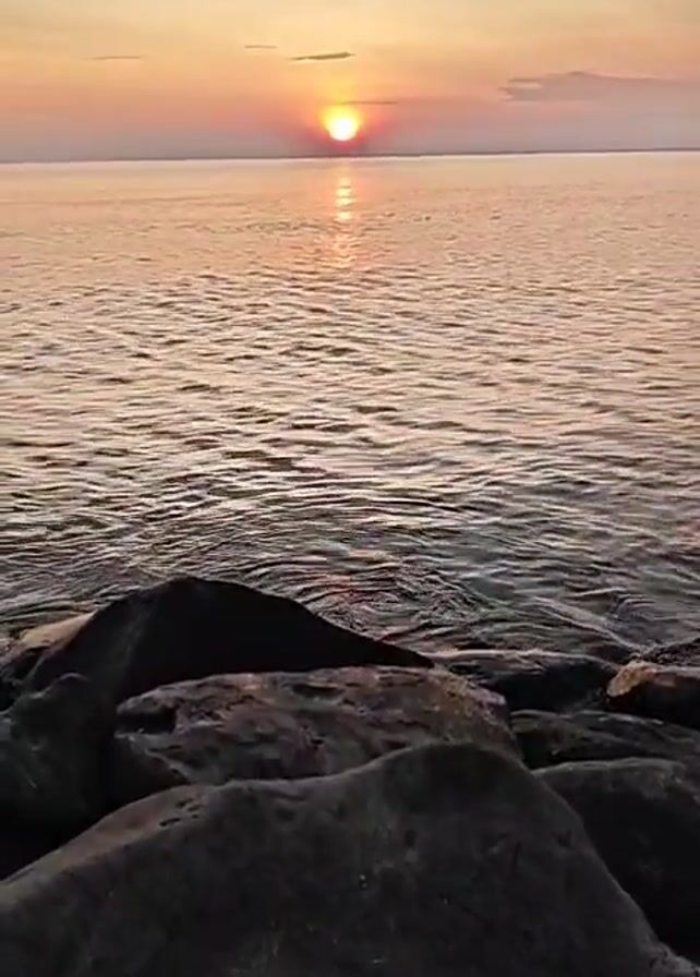 sunset over the ocean, viewed from a rocky shoreline. The sun is low on the horizon, casting a bright reflection on the water. The sky is a mix of orange, pink, and pale blue hues. There are a few wispy clouds in the sky. The water is calm, with gentle ripples. In the foreground, there are several large, dark rocks. The camera angle slowly tilts upwards.