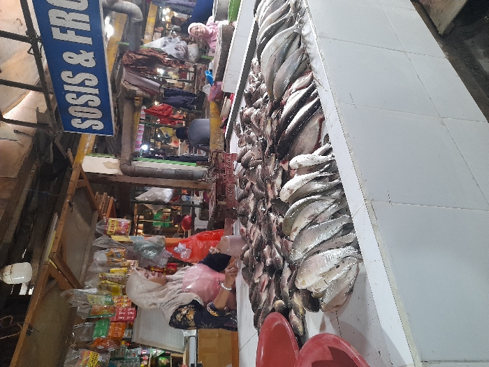 A bustling market scene displays various commodities. On the right, a towering stack of fresh fish dominates the view, neatly arranged on a white tiled surface. To the left, a woman wearing a hijab stands amongst shelves laden with goods and treats. A sign overhead reads "Sosis & Fro". A general view of a busy market environment is captured in the background.