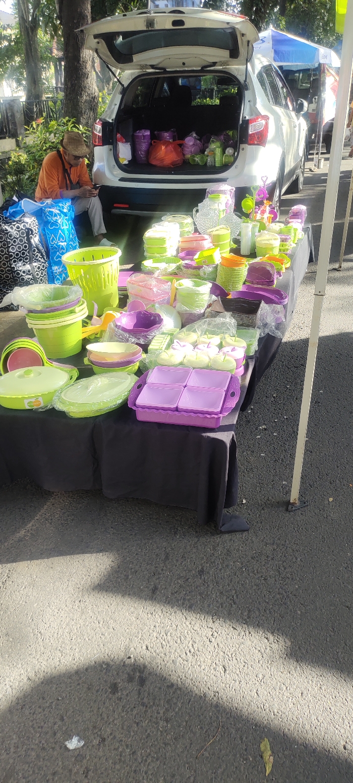 street scene in Kecamatan Sidoarjo, Indonesia, at the coordinates -7.442 latitude and 112.705 longitude. A white car with its trunk open is parked on the right side of the image. In the trunk, there are various plastic containers and a red bag. A man wearing a straw hat and a blue shirt is sitting on the left side of the image, looking at a mobile phone. There are many colorful plastic containers and tubs of different shapes and sizes spread out on the ground in front of the car. The containers are arranged in rows on a black tablecloth, with a white canopy pole in the background. There is a green leafy plant to the left, and a gray pavement with a white stripe on the right. The scene is located outside in a sunny environment with shadows from the canopy pole visible on the pavement.