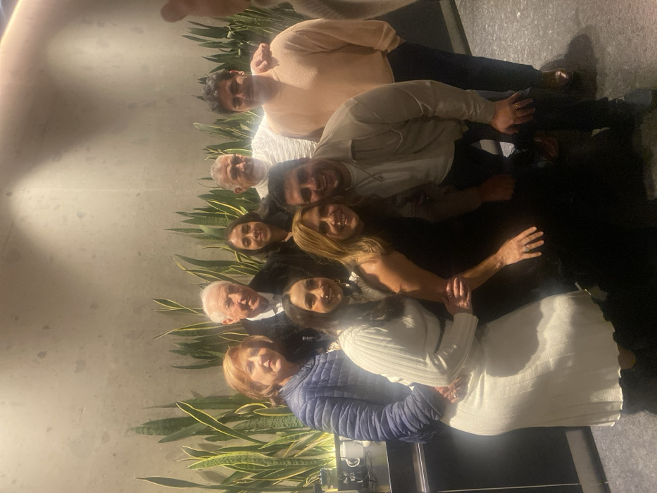 Nine people pose for a group photo. From top to bottom, a man in a salmon-colored sweater stands next to a man in a white shirt. Below them, a man in a gray hoodie and a man with white hair and a black blazer are positioned. Three women are in the center. The lowest layer includes a woman in a quilted jacket and a woman in a white dress and sweater. Foliage is on the left, and a gray wall is on the upper left.