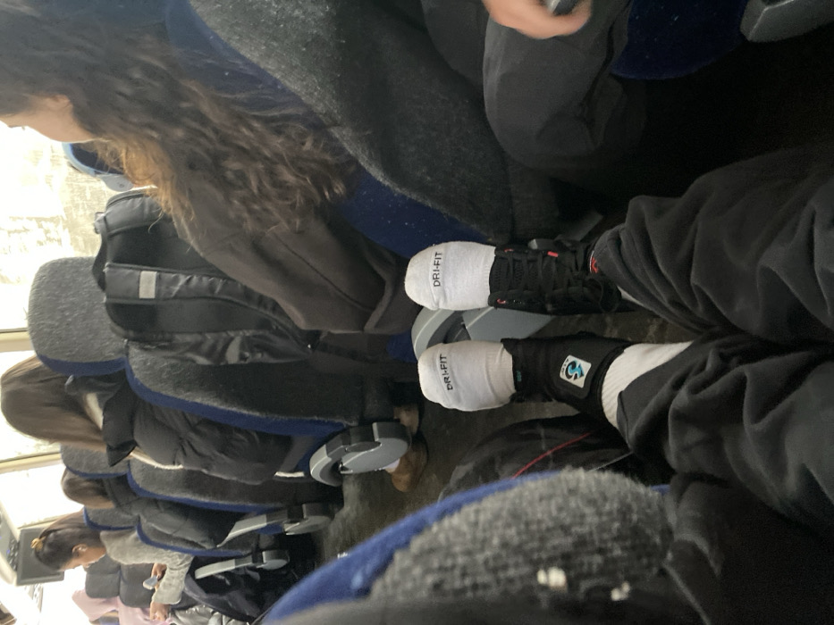 A person in a crowded vehicle has their feet in view. They wear white socks with "DRI-FIT" written on them. One foot has a black shoe, the other has a black brace over the sock. Both legs are clad in dark clothing. Passengers are visible in the background sitting in rows of seats. Luggage is positioned near their feet and in overhead compartments. The vehicle appears to be a train or bus.