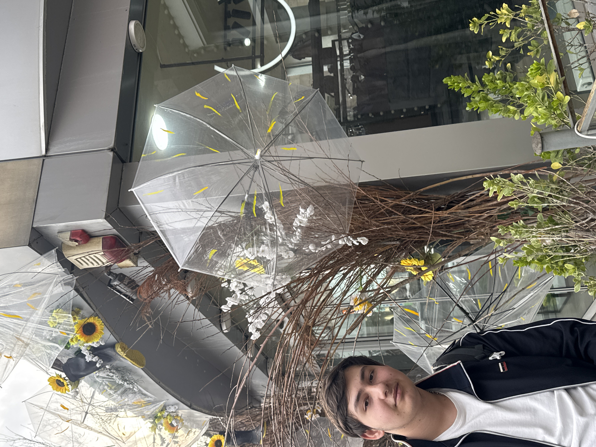 The image depicts a person standing in front of a display of clear umbrellas decorated with yellow and white flowers and brown branches