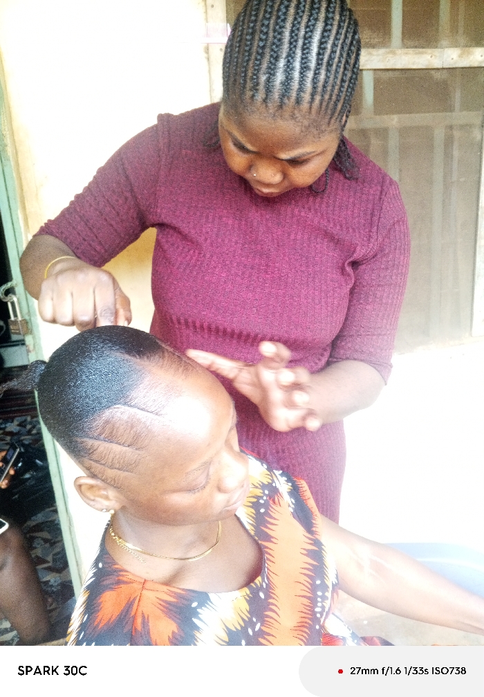 Two adult females are positioned in what appears to be an indoor or semi-outdoor hair styling area