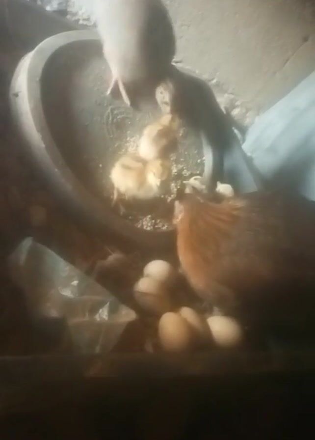 In a dimly lit, enclosed space, a hen with brown and gray feathers stands beside a cluster of eggs. Several small, yellow chicks are visible near a shallow dish containing food. Other hens, some with gray feathers, also peck at the food in the dish. The interior appears rustic, with weathered wooden surfaces. The camera is handheld and shaky, making the view unstable.