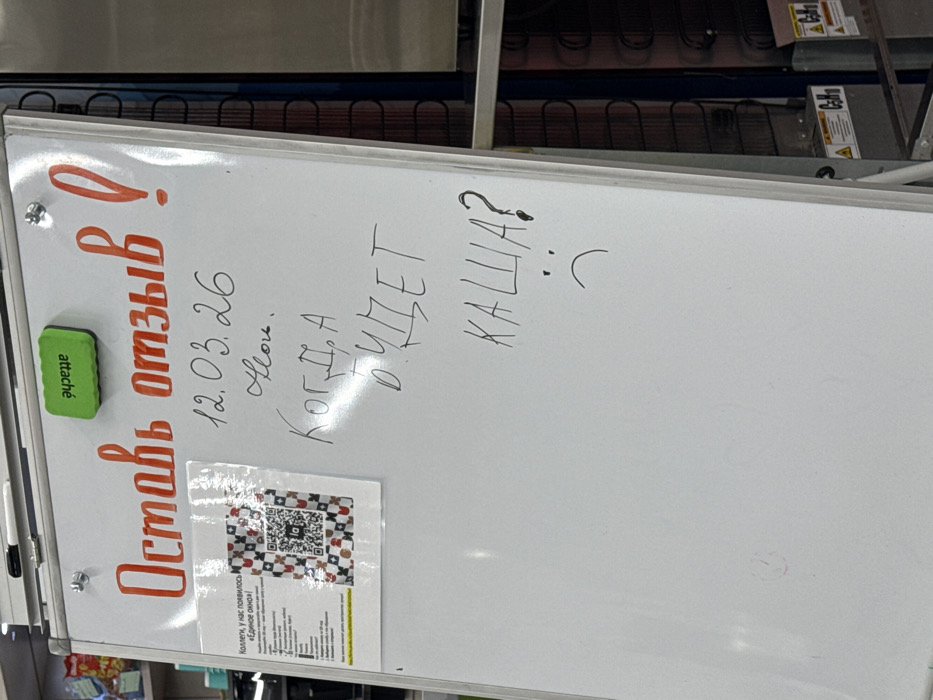 An upright white easel-style whiteboard is positioned within an indoor commercial or cafeteria environment in Sof'ino, Russia. A green magnetic eraser, labeled "attache" and oriented upside down, is attached to the top center of the whiteboard. Below it, in prominent orange script, the phrase "Оставь отзыв!" (Leave a review!) is written, followed by an exclamation mark. Below this, handwritten in black marker, are the characters "12.03.26," followed by "Люд.," and then the query "КОГДА БУДЕТ КАША?" (When will there be porridge?), concluded with a question mark. A hand-drawn sad face emoticon, ":(", is inscribed beneath the question. On the upper left portion of the whiteboard, a laminated white paper document is affixed, featuring a prominent QR code and Russian text. The visible heading on this document states: "Коллеги, у нас появилось «Единое окно»!" (Colleagues, we have a "Single Window"!). The background on the left side of the frame shows blurred shelving units stocked with various packaged goods. To the right, a large, industrial-style refrigeration unit or cooler, featuring visible metal shelving and yellow warning labels, is partially visible.