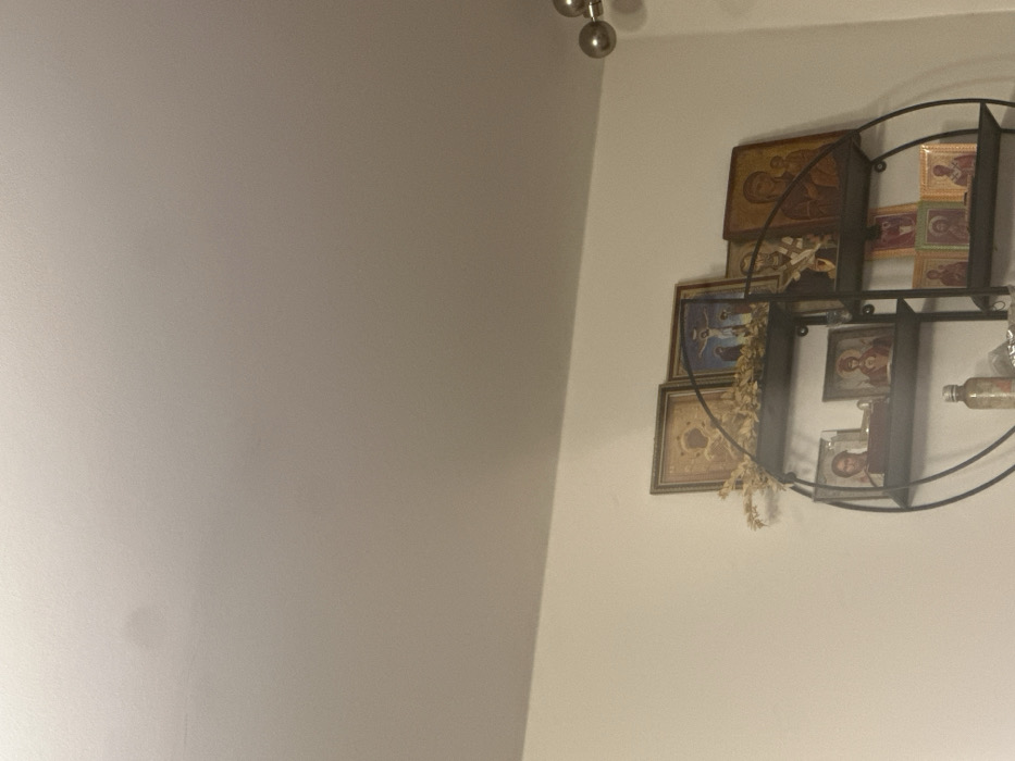 The image displays an interior residential scene located in Colombes, France. The upper two-thirds of the frame are occupied by a light-colored, flat ceiling, featuring a faint, circular discoloration in the upper-left quadrant. A sharp horizontal line separates the ceiling from a similarly light-colored wall. In the lower right quadrant, a dark, multi-tiered metal shelving unit, characterized by circular or curved structural elements, is mounted against the wall. The shelving unit and the adjacent wall serve as a display for numerous religious icons. On the uppermost tier and wall area, several framed icons are visible, including a depiction of a crucifixion, an icon featuring a haloed figure or a sunflower-like motif, and an icon portraying the Madonna and Child. Dried, light-colored botanical elements are arranged on the top shelf. The middle shelf holds a framed icon of a single figure, a small dark wooden box, and another framed icon. The lowest visible shelf contains a row of smaller framed icons alongside a clear glass bottle containing an amber liquid and sealed with a dark cap. A partial view of a spherical metallic light fixture element is observable in the upper right corner of the image. No people are present.