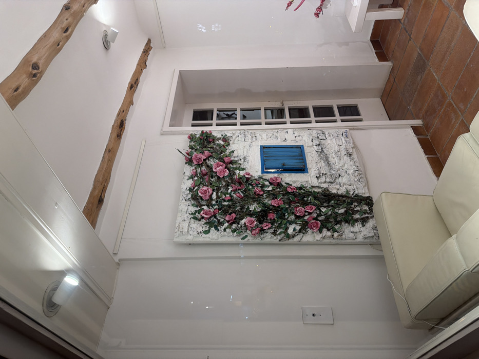 The image presents an interior room located in Eivissa, Spain. The room features white painted walls and a white ceiling with two exposed, rough-hewn wooden beams. Several white track spotlights are affixed to the ceiling, one directing illumination onto a large, vertically oriented artwork on the left wall. This artwork depicts a textured white brick wall against which a dense, sculpturally rendered climbing rose bush with numerous pink blooms and green foliage is presented. A small, distressed blue-shuttered window is integrated into the lower-right section of the artwork's brick wall representation. In the lower-left foreground, a light-colored, upholstered armchair or sofa section is visible. To the right of the artwork, a white-framed door with multiple rectangular glass panes stands partially open, revealing a dark interior beyond. The floor is composed of square terracotta-colored tiles, bordered by a reddish-brown baseboard. A white electrical outlet or switch is mounted on the left wall. On the far right, a minimalist white rectangular table or pedestal supports a decorative item with red or pink components, likely a floral arrangement.