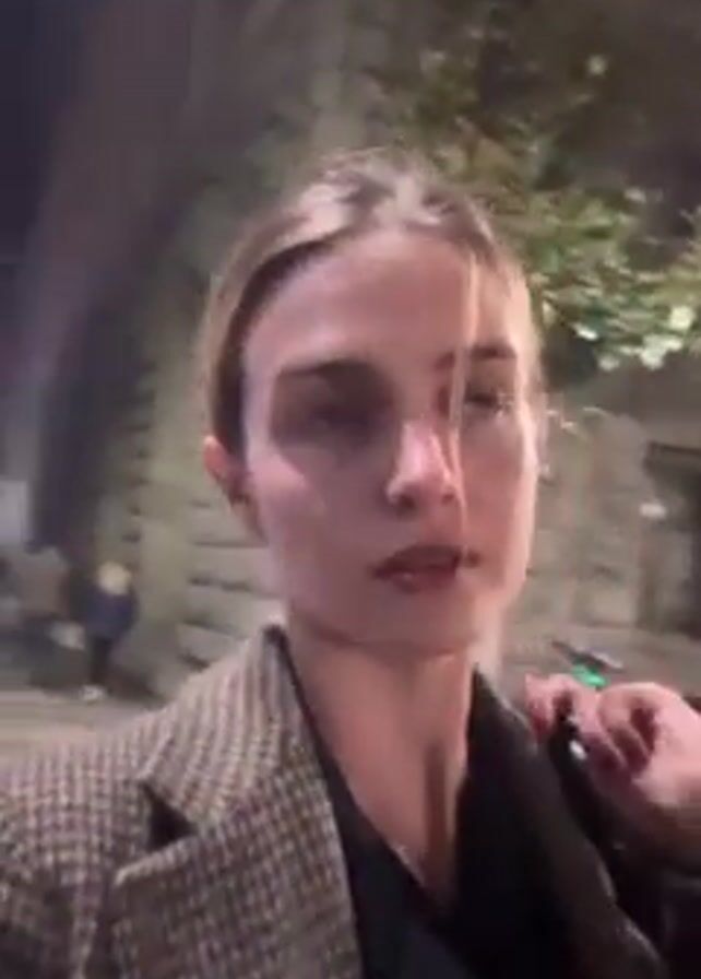 A young woman is recording a selfie video outdoors at night. She is wearing a brown plaid blazer over a black shirt, with her light brown hair pulled back. She appears to be walking along a sidewalk, with a stone wall and trees visible in the background. Streetlights provide illumination. Other people can be seen walking in the background, and a bicycle is parked nearby. The camera is handheld, resulting in some shakiness.