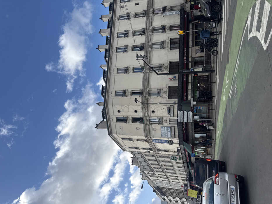 The image depicts a street scene at the corner of Avenue de la République in Aubervilliers, France, under a partially cloudy blue sky. The central subject is a prominent six-story, light-colored corner building, likely constructed from stucco or painted stone. Its facade exhibits extensive vertical cracking, particularly on the left side and corner. The building features multiple windows on each floor, many equipped with wrought iron Juliet balconies. The roofline includes several chimneys and dormer windows. The ground floor of this building houses "Le Triomphe," identified by signs as a Hôtel, Restaurant, Bar, and Brasserie, with "Amstel" branding also visible. A vertical blue sign on the building's corner reads "HOTEL à la journée LA NUIT." Buildings of similar architectural style extend down the street to the left. The street in the foreground is asphalt, featuring a green-painted bicycle lane with white markings, including a bicycle symbol and chevrons. A white pedestrian crosswalk is visible on the right. Vehicular traffic includes a silver Renault Laguna (license plate BE-373-HD) in the immediate foreground, a black van behind it, and a black SUV and a yellow taxi partially visible further down the road on the right. A person on a black motorbike or scooter is stopped near the pedestrian crossing. Several pedestrians are present on the sidewalks, some walking, others standing near the storefronts of Le Triomphe. Street furniture includes black lampposts, traffic lights (one displaying a yellow signal), and a multi-directional signpost indicating destinations such as "Aubervilliers," "Montreuil," "Pont Blanc," and "Mairie."