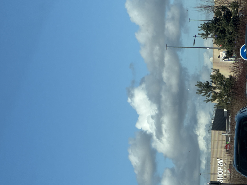 The scene depicts an outdoor commercial or retail environment in Lampertheim, France, under a bright blue sky with scattered cumulus clouds. The upper portion of the image is dominated by clear blue sky. Below, a band of white and grey clouds spans horizontally across the mid-upper section. The midground features a large commercial building complex. On the left, a building displays the white lettering "SHOP'IN" and "INDO" against a dark background. To the right, a lighter-colored section of the building shows partial French text: "Heureux de vous accueillir !" A red circular sign with a horizontal white bar (indicating a prohibition or stop) is visible near the "SHOP'IN" structure. Further right, another blue and white sign, partially obscured, shows text like "STATION SERVICE" and "2000 M." Several tall, dark light poles are distributed across the midground. Sparse green coniferous trees and bare shrubs are present in the midground and foreground, partially obscuring the buildings and signs. The immediate foreground shows the top portion of a dark vehicle, from which the image was likely captured, along with more vegetation and a partially visible blue circular road sign with a white arrow pointing right. No individuals, specific actions, or interactions are visible.