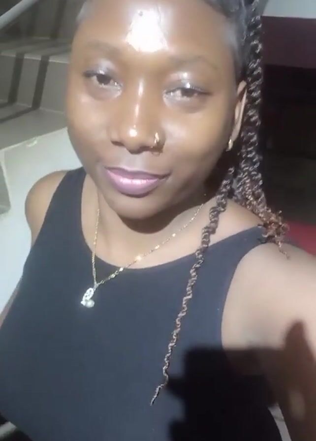 A woman with dark skin, wearing a black tank top and a gold necklace, stands in front of a staircase. She has a nose ring and her hair is styled in braids. The lighting is somewhat dim, and the background includes a metal railing and a partial view of a red surface. She looks at the camera and smiles slightly. Sounds of children can be heard in the background.
