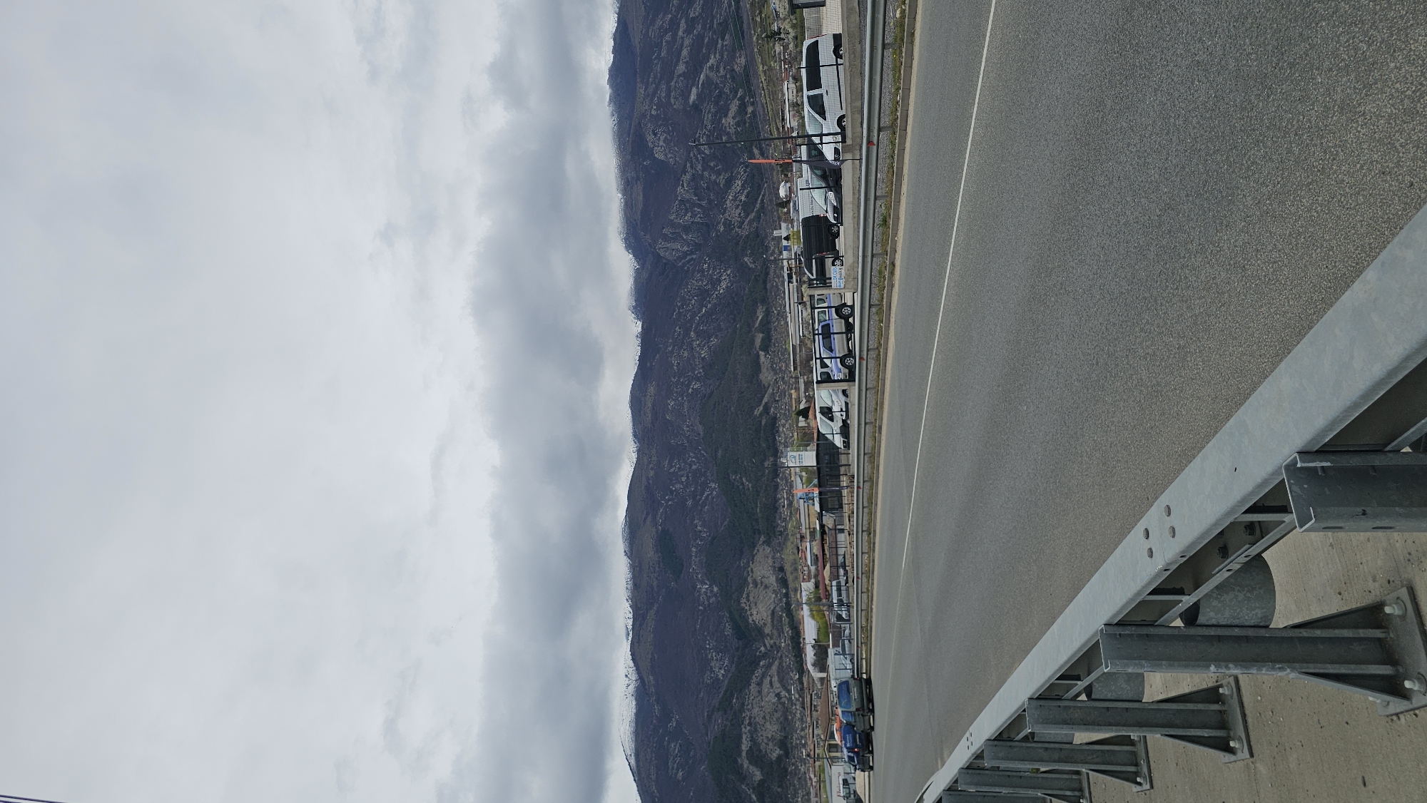 The image depicts a scene in Karlovo, Bulgaria, featuring a multi-lane highway running parallel to a mountain range. On the side of the highway, adjacent to a metal guardrail, are several parked vehicles, primarily vans. The mountains rise in the background, partially obscured by clouds. The sky is overcast.