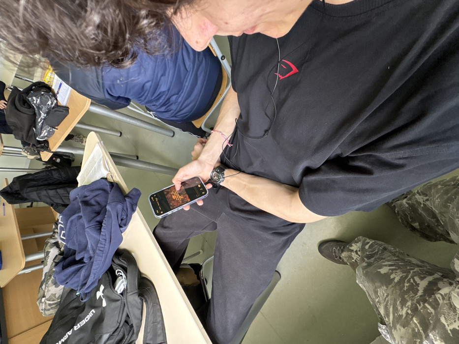 The image presents a classroom setting in Dimitrovgrad, Bulgaria. The perspective is from an individual positioned with their legs visible in camouflage-patterned pants and dark shoes. To the right, a person with dark, curly hair, wearing a black t-shirt with a red "Republic of Gamers" logo, is seated. This individual holds a light-colored smartphone in their left hand, its screen displaying an image or video with text and graphical elements. A black wired earphone cable extends from the phone across their right arm. A black digital watch and a pink braided bracelet are present on their right wrist. Directly in front of this individual, on a light-colored wooden desk, rests a black "Under Armour" backpack, a folded dark blue hooded sweatshirt, and an open book. In the background, other student desks and chairs are visible. Another student, seen from behind and wearing a blue puffer vest, occupies a desk in the upper right quadrant of the image, with a black backpack and a pencil case on their desk. The floor is light green.