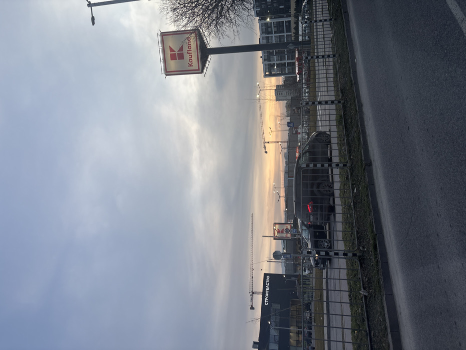 The image presents an urban landscape at dusk or dawn, characterized by an overcast sky with an orange-yellow glow on the horizon. In the foreground, a paved asphalt road runs parallel to a concrete curb, behind which a low metal barrier fence with vertical bars stands. Beyond the fence, two dark-colored SUVs are visible on a paved surface, suggesting a road or parking lot. A prominent, illuminated billboard sign for "Kaufland," displaying its red 'K' logo and name, is situated on a tall pole in the midground. To the left, a dark-colored commercial building features a sign with the Cyrillic word "СТРОИТЕЛСТВО" (Construction). The background is dominated by multiple multi-story buildings and several large construction cranes, indicating ongoing development. A street lamp is visible on the far right. No identifiable individuals are present. The scene is set in a commercial and residential development area within Unknown, Unknown.