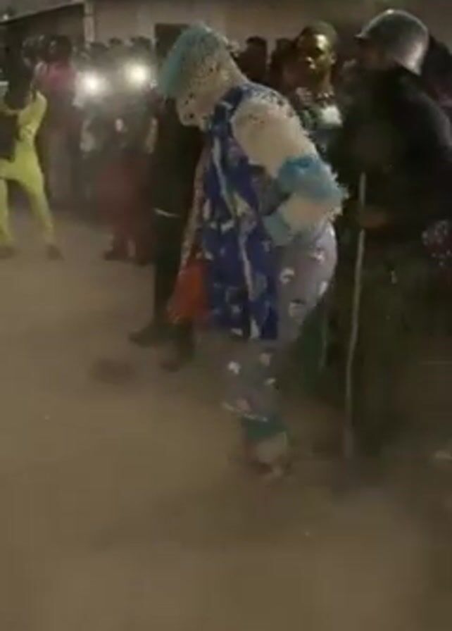 masked figure performing a dance in a dusty outdoor setting. The figure is dressed in an elaborate, multicolored costume with a blue patterned backpack. The figure is surrounded by a crowd of onlookers, some of whom are holding up cell phones to record the performance. A police officer stands nearby with a baton. In the background, there are buildings and trees. The overall atmosphere suggests a festive or cultural event.