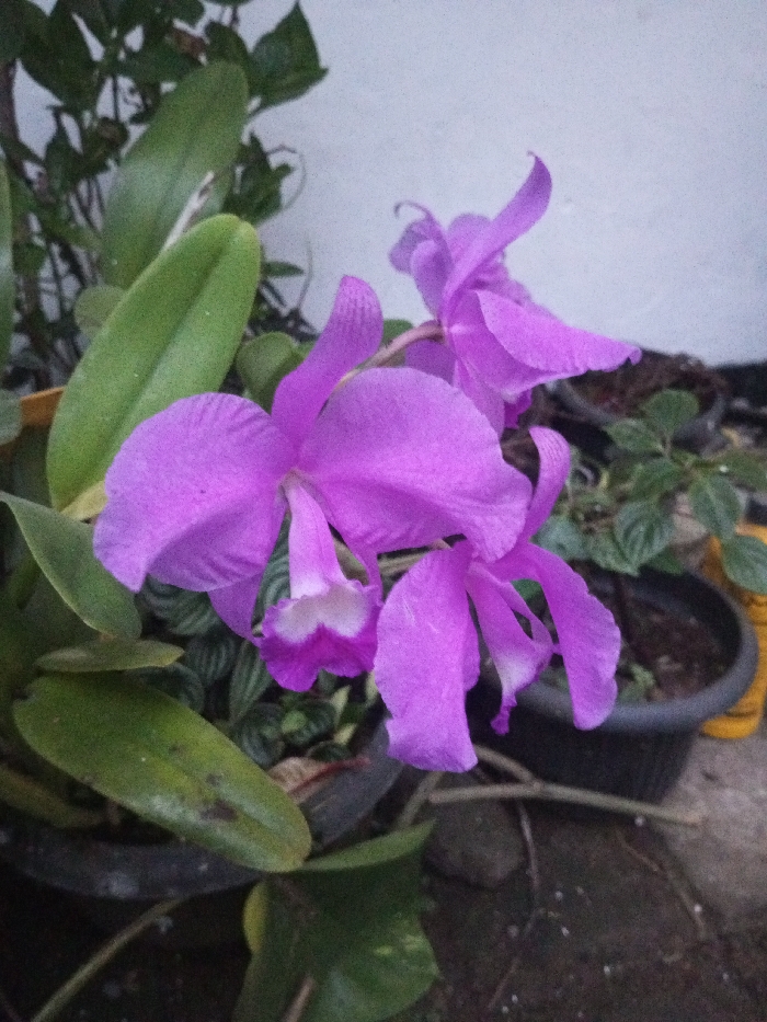 - "A close-up photograph depicts three vibrant purple orchid flowers in bloom, surrounded by green foliage, located in B" by FM-25tUC3, licensed under CC BY 4.0
