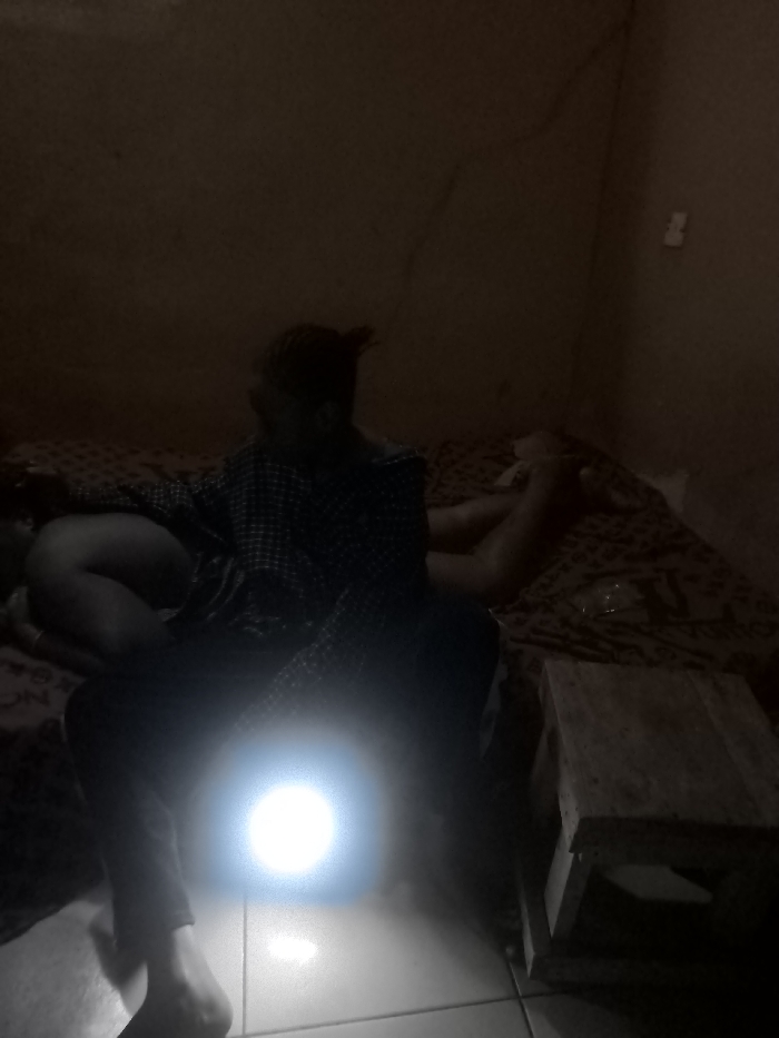The image depicts an interior scene within a dimly lit room in Unguwar Gabas, Nigeria. The room features light brown or beige walls, one of which shows a vertical crack. A white electrical outlet or switch is visible on the right wall. The floor is covered with light-colored square tiles. A bed occupies a significant portion of the scene, covered with a brown and beige patterned blanket. In the foreground, an individual is seated on the tiled floor, facing away from the camera. They wear dark pants and a dark, possibly checkered or patterned long-sleeved shirt. Their hair is styled in a top bun or ponytail. A circular, bright white light source emanates from their lap area, casting illumination onto the floor directly in front of them. Behind this individual, a second person is lying on their stomach on the bed, partially obscured. Their lower body and legs are visible on the patterned blanket. To the right of the seated individual, adjacent to the bed, is a small, light-colored wooden stool or table. A clear plastic bag or object is discernible on the bed near the second individual. No direct interaction between the two individuals is evident.