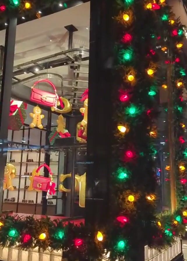 Coach store window decorated for the holidays. The frame of the window is lined with green garland and old-fashioned large, colorful Christmas lights in red, green, and yellow. Inside the window display, there are several pink Coach purses on display, along with gold-colored charms and gingerbread men hanging from a conveyor belt system. Another section of the window features a mannequin wearing a black maxi dress and a black leather jacket, also with Coach items. The lower portion of the window is decorated with garland similar to that on the outer frame, and clear glass blocks make up the base. The store's logo is visible above the window.