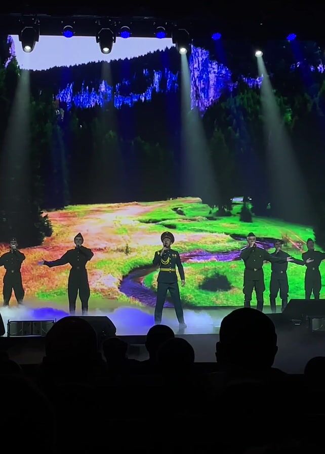 A stage performance is in progress, featuring a singer in a green military-style uniform. Five other performers in similar outfits stand beside the singer. The backdrop is a large LED screen displaying a nature scene, first a green valley with a river and then a mountain range under a blue sky with clouds. Spotlights are focused on the performers, with fog creating a hazy effect on stage. The audience is visible in silhouette.