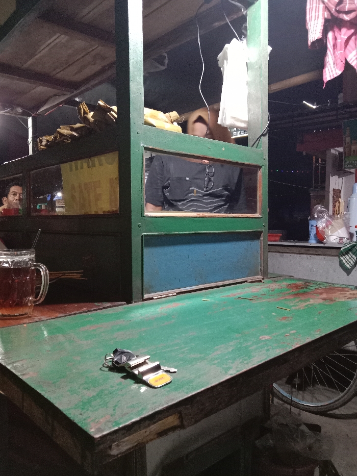 A green, metal food cart with a blue panel on the side. The cart has a glass window that is currently occupied by a person sitting inside. The person is wearing a black t-shirt with white stripes, black pants, and a black watch. The person is wearing black sunglasses on their head. The person's face is not visible. There is a yellow sign in the window that reads "MANGGA." On the table top is a silver key chain with a yellow label. There is a cup of brown liquid on the counter, and a partially visible man wearing a black shirt and dark hair is sitting in a chair to the left of the cart. In the background, a person with a bright pink shirt can be seen walking outside the cart. The cart is located in Kecamatan Kaliwungu Selatan, Indonesia (latitude: -6.961, longitude: 110.245).