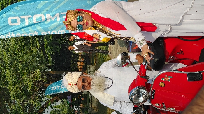 A man and a woman, both wearing traditional South Asian attire, are sitting on a red scooter. The man sports a white turban and beard, while the woman wears a decorated headpiece, sunglasses, and a red scarf. They are flanked by a blurred backdrop of trees and buildings. In the background, two men in suits can be seen standing. A blue banner with the word "OTOMOTO" is partially visible in the scene.