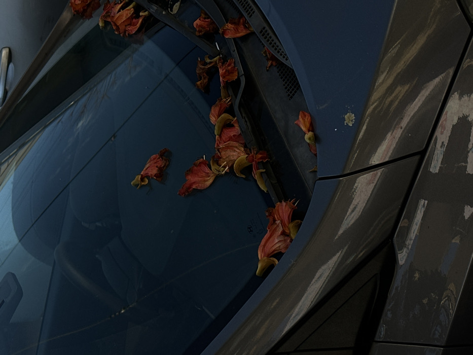 - "A car's windshield and hood are covered with fallen, orange-red flowers" by FM-jqiIm2, licensed under CC BY 4.0
