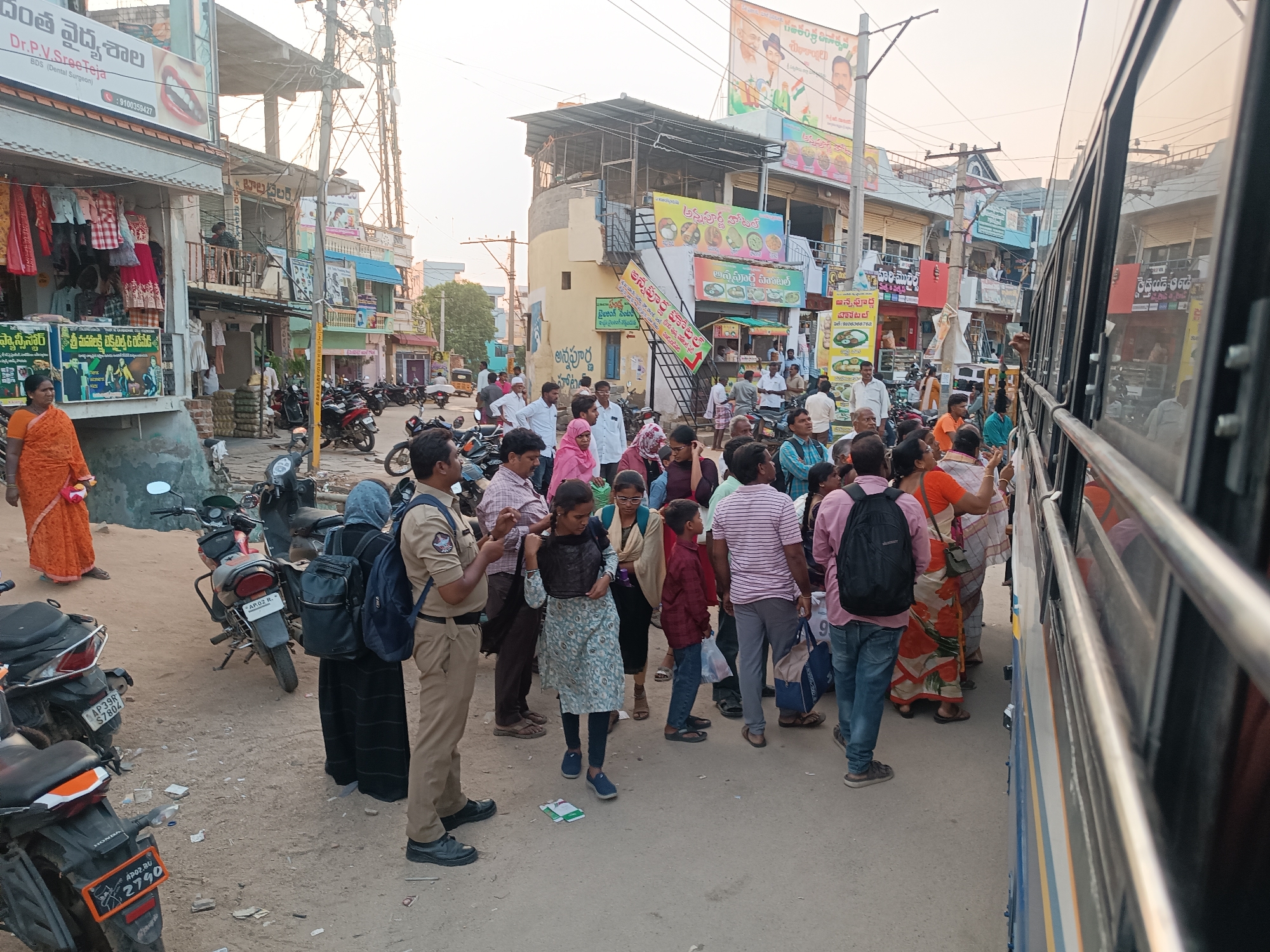 The image presents a busy street scene in Kothacheruvu, India. Approximately 25-30 individuals, mostly adults, are congregated near a blue and white bus that occupies the right side of the frame. The ground is an unpaved dirt surface with scattered debris. Multi-story commercial buildings line the street. On the left, a building displays a sign for "Dr.P.V.SreeTeja BDS (Dental Surgeon)" and "దంత వైద్యశాల" (Dental Hospital), with clothing items visible for sale. A yellowish corner building in the mid-ground features "అన్నపూర్ణ హోటల్" and various food advertisements. Overhead utility poles, power lines, and a large cellular tower are visible against a bright, hazy sky. Numerous motorcycles and scooters are parked along the street, with license plates such as "AP 02 RU 2790" and "AP 39R S7804" identifiable. An auto-rickshaw is partially visible further down the street. Key individuals in the foreground include: * A male police officer in a khaki uniform, black shoes, and a dark blue backpack, holding a device in his hands. * A woman adjacent to the officer, wearing a black abaya, light blue hijab, and a dark blue backpack. * A young girl in a light blue and white patterned dress, dark leggings, and blue sneakers, holding a dark bag. * A boy in a maroon long-sleeved shirt and blue jeans. * A woman in an orange saree is visible on the far left. The crowd appears to be either waiting to board the bus or disembarking, with individuals standing and looking towards the bus or engaging in conversation.