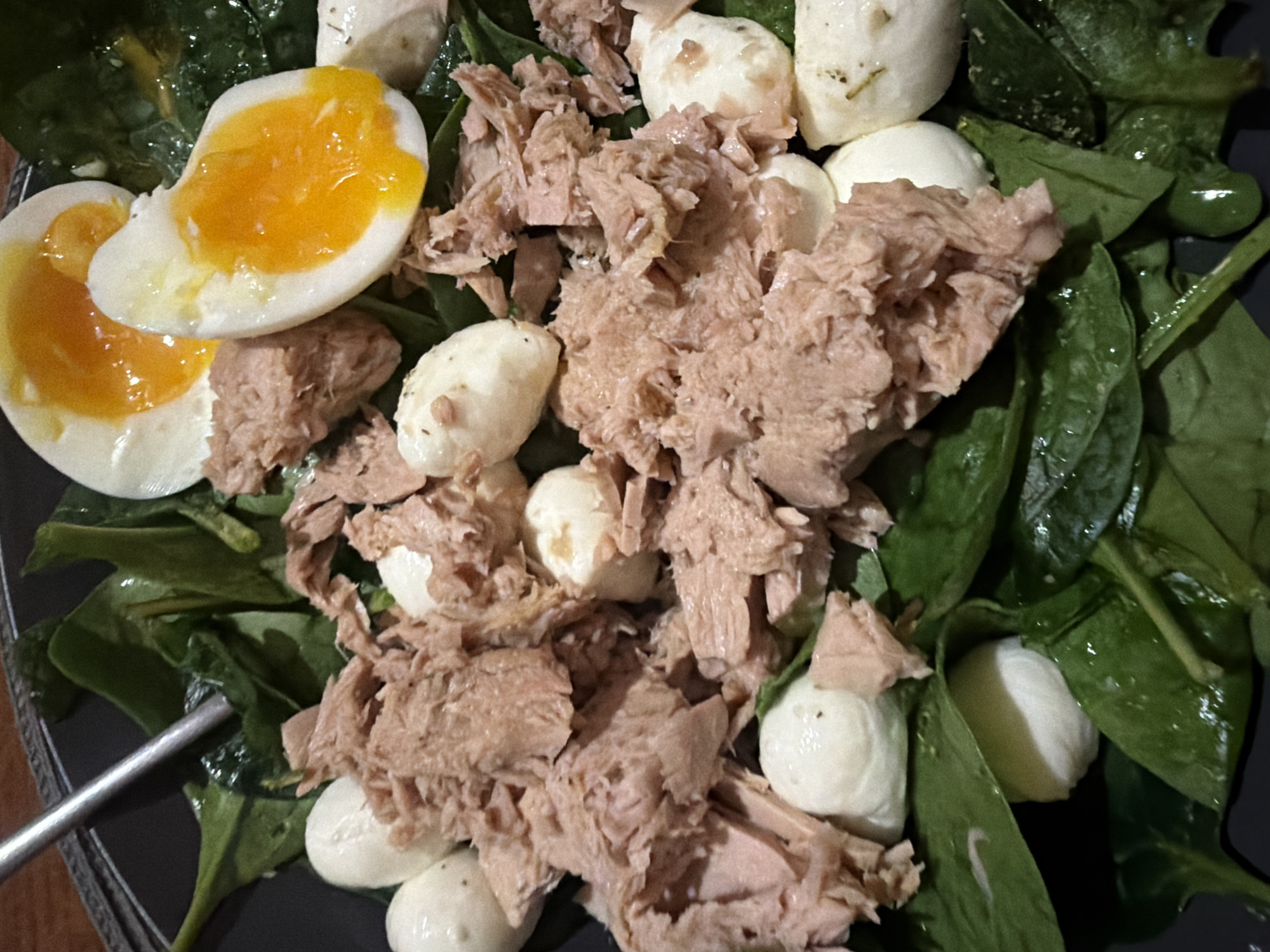 A close-up shot reveals a food dish comprised of spinach leaves, torn tuna, small white mozzarella balls, and halved hard-boiled eggs with runny yolks