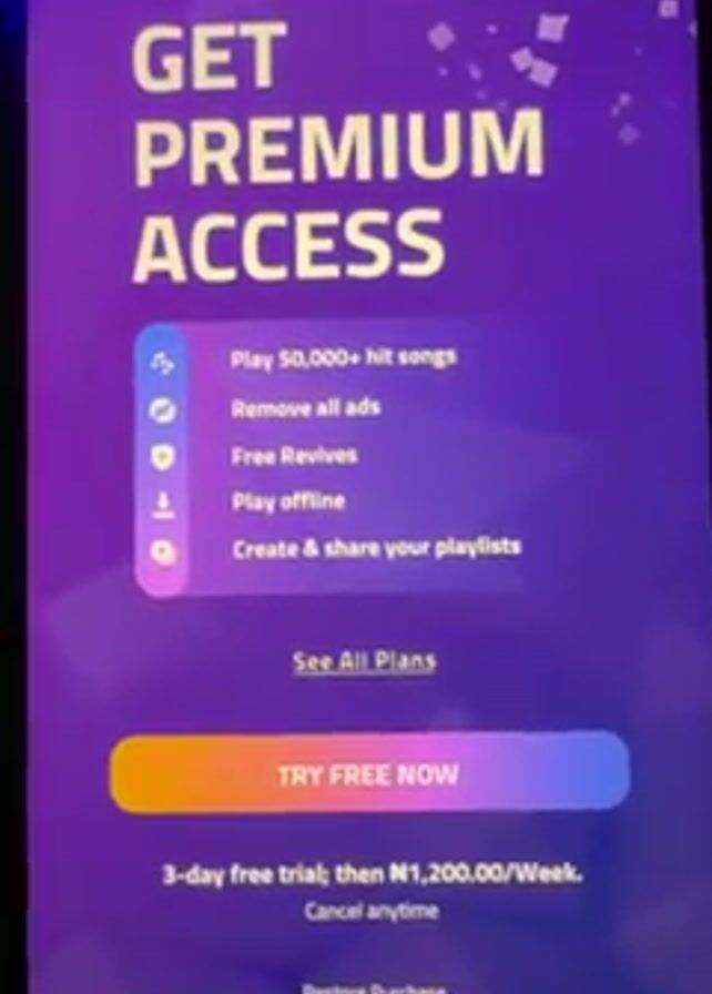 A mobile device displays a "Get Premium Access" offer from a music app. The offer includes features like playing over 50,000 hit songs, removing ads, free revives, offline playback, and creating/sharing playlists. A "Try Free Now" button is highlighted. Below, it states there's a 3-day free trial, then the cost is 1,200 Nigerian Naira per week, and cancellation is possible anytime. A song is playing in the background.