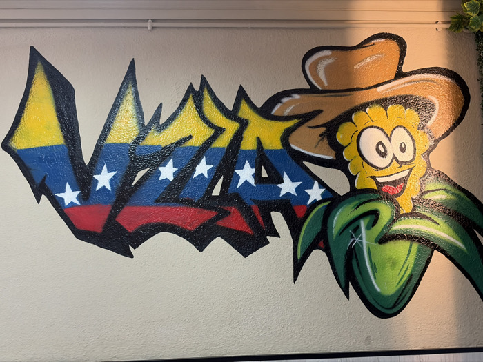 A mural is painted on a light beige, textured wall in Barberà del Vallès, Spain. The artwork features stylized block letters on the left, outlined in black and filled with the horizontal colors of yellow, blue, and red, consistent with the Venezuelan flag. Eight white five-pointed stars are visible across the blue stripe of the letters. To the right, a cartoon anthropomorphic ear of corn is depicted, wearing a light brown cowboy hat. The corn character has a yellow body with a textured surface, wide white eyes with black pupils, a broad red mouth, and green husks forming its lower body. A warm, directional light source illuminates the upper right quadrant of the mural, creating a distinct shadow line along the top of the wall. A small cluster of dark green artificial foliage is partially visible in the extreme upper right corner.
