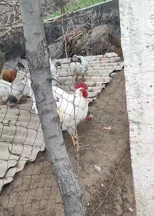 group of chickens in an enclosed area, behind a wire fence and a tree trunk. The chickens are of various colors, including white, brown, and black and white. The ground is dirt with some debris scattered around. Some pieces of roofing material are placed against the fence on the inside. The fence borders a white wall.