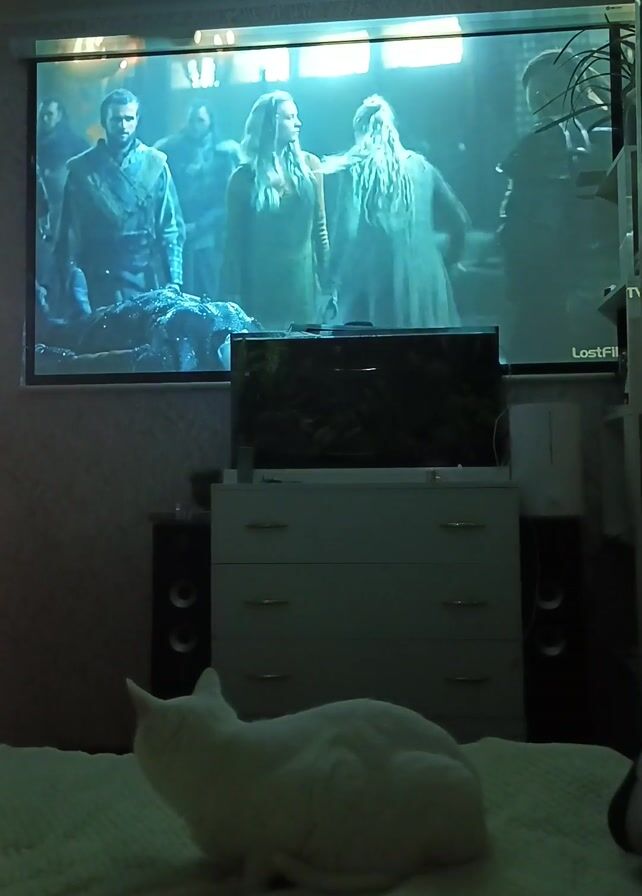 A white cat is sitting on a bed, facing a television that is projecting a film onto the wall. The film appears to be a fantasy-genre production with characters in medieval-style clothing. Text on the screen reads "Director of Photography Peter Robertson." Below the projection screen is a dresser with a smaller television on top of it. Two speakers flank the dresser. A plant is visible in the background on the right side of the frame. The room is dimly lit, with the primary light source being the projection on the wall.