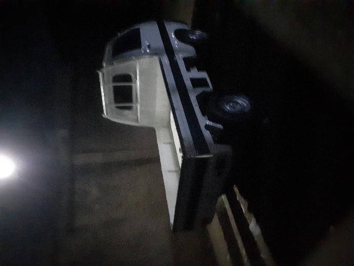 A silver and white vehicle, possibly a truck or utility vehicle, is parked at night. It has a distinct cabin area with windows and a flatbed. Dark stripes run along the sides. The surroundings are dimly lit, with a light source causing glare in the left. A fence or wooden structure appears on the right side of the image. The picture is rotated, presenting the vehicle sideways.