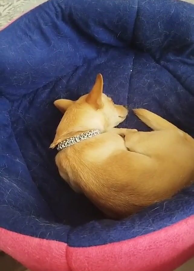 - "A small, light brown dog is curled up in a pink and blue pet bed" by FM-9E6Vn1, licensed under CC BY 4.0