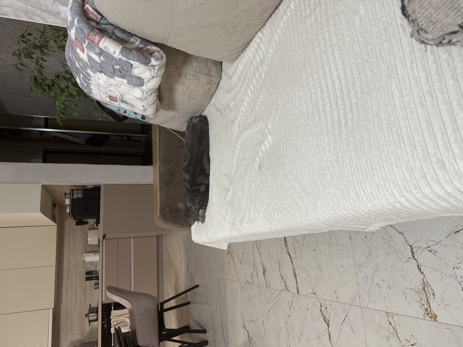 A gray tabby cat sits near the edge of a white corduroy sofa with a beige cushion and a folded patterned blanket. The sofa is positioned next to a marble-patterned floor. Adjacent to the floor is a kitchen with a beige color scheme, featuring a counter, cabinets, and bar stools. A plant is visible in the background, partially obscured by the sofa.