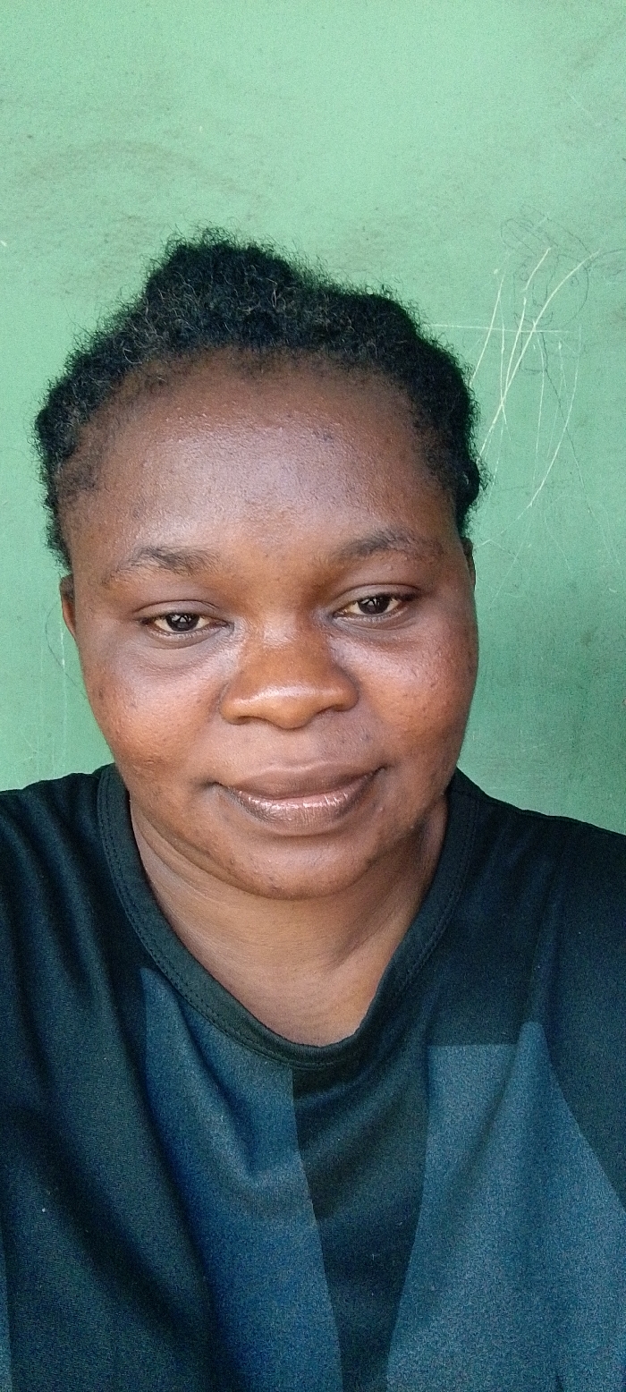 A headshot photograph depicts an adult female of African descent, centered against a light green, painted wall