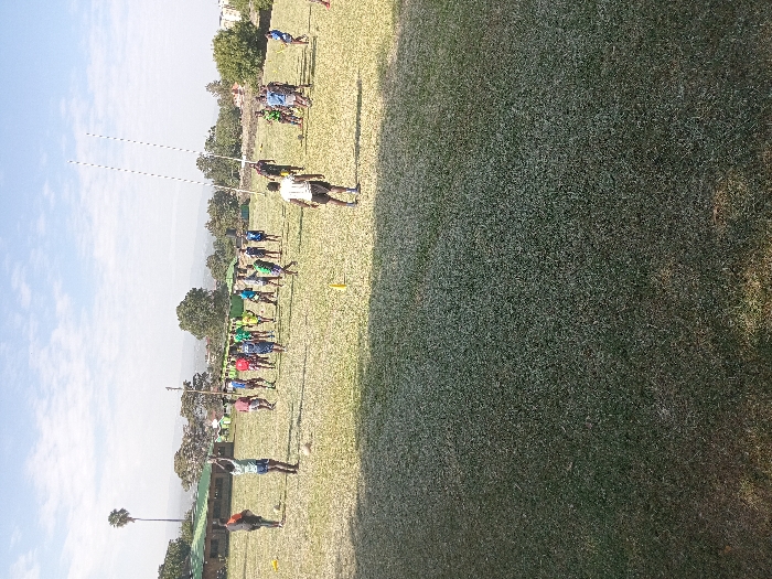 A grass field, likely a sports ground, dominates the scene. People stand in a row facing a set of posts, possibly for javelin practice or a similar throwing activity. A few trees and low buildings are visible in the background, suggesting a park or school setting. The sky is blue with light clouds, and the scene is lit by bright sunlight.